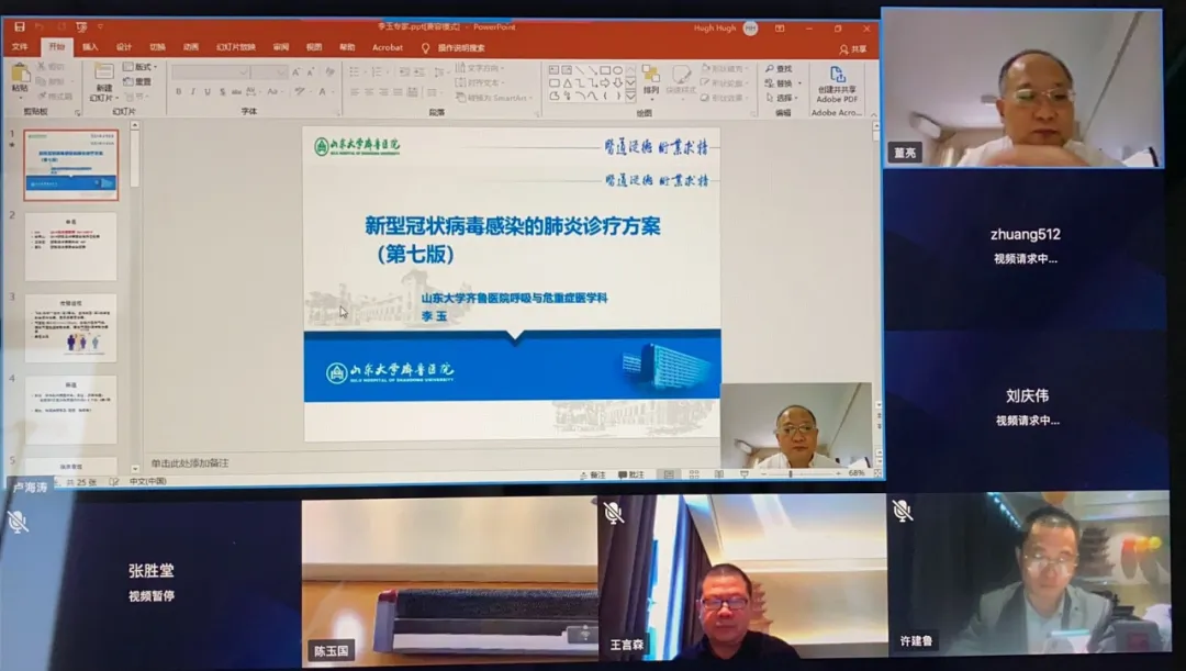 山东大学齐鲁医院院长陈玉国教授、山东省健康管理协会呼吸病学专委会主委、齐鲁医院呼吸与危重症医学科主任董亮教授、目前在武汉进行医疗援助工作的齐鲁医院呼吸与危重症医学科李玉教授、山东省立第三医院呼吸与危重症医学科王言森教授、山大二院呼吸科与危重症医学科、驻潍坊新冠肺炎救治中心专家组组长徐少华教授、青岛市市立医院呼吸与危重症医学科刘学东教授及省内多家医院呼吸与危重症医学科专家等参加视频会议,会议由董亮教授和山东省中医院张伟教授主持。